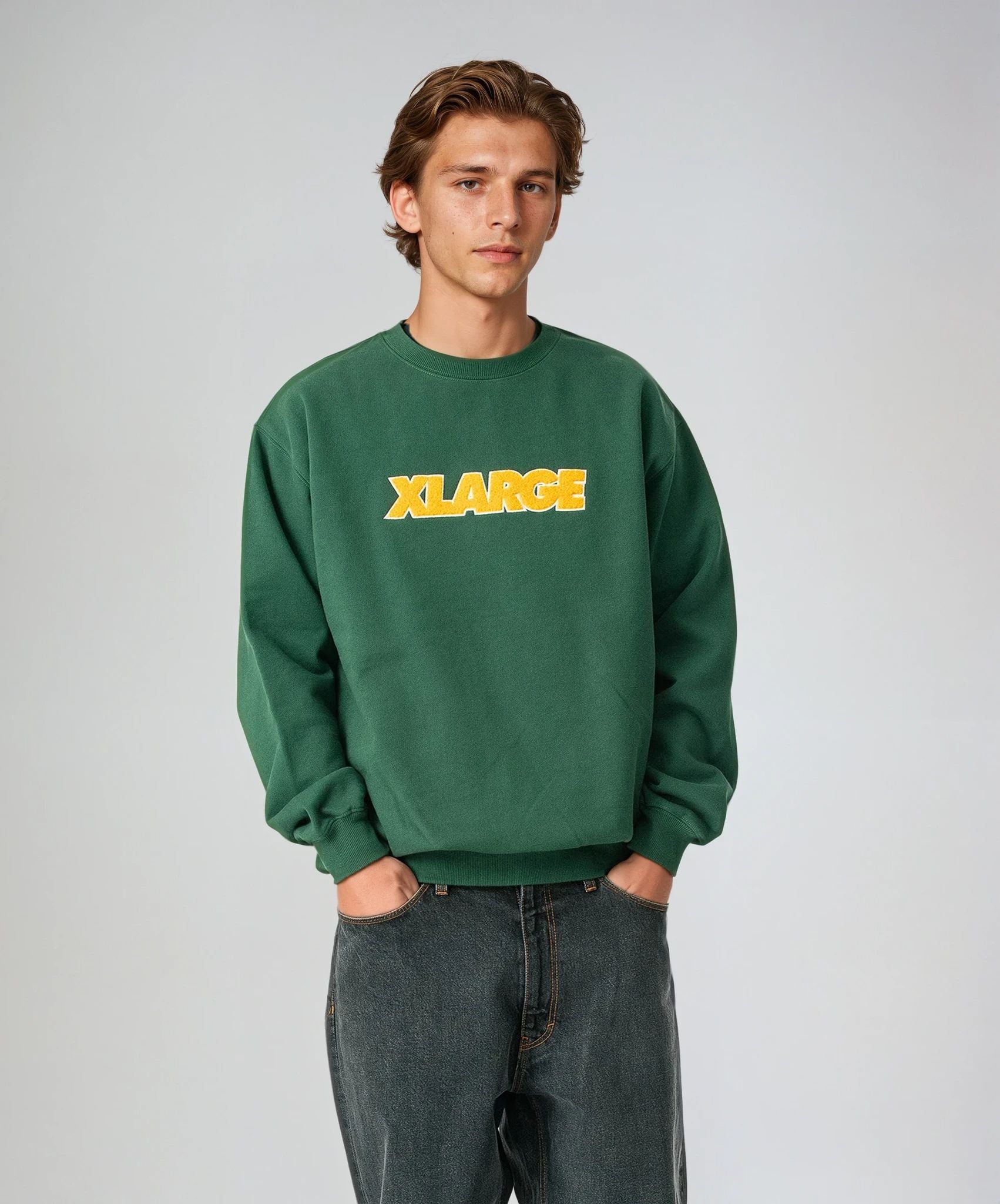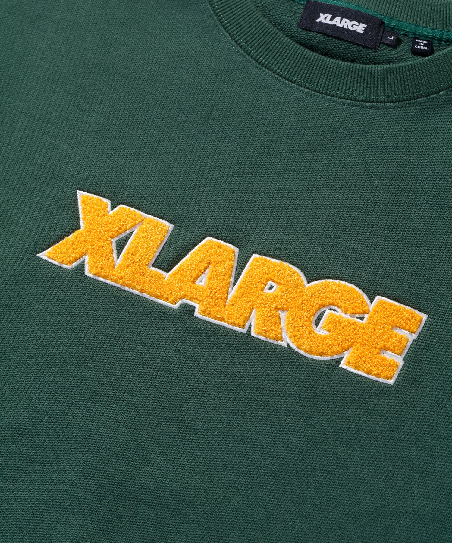 A crewneck sweatshirt featuring the XLARGE Standard Logo in sagara embroidery on the front.