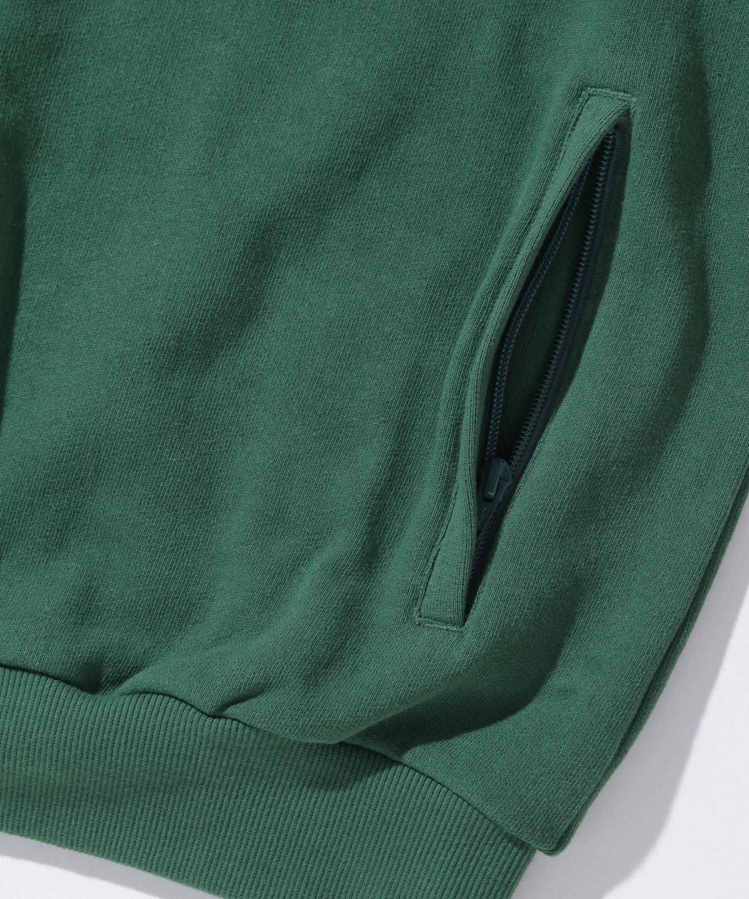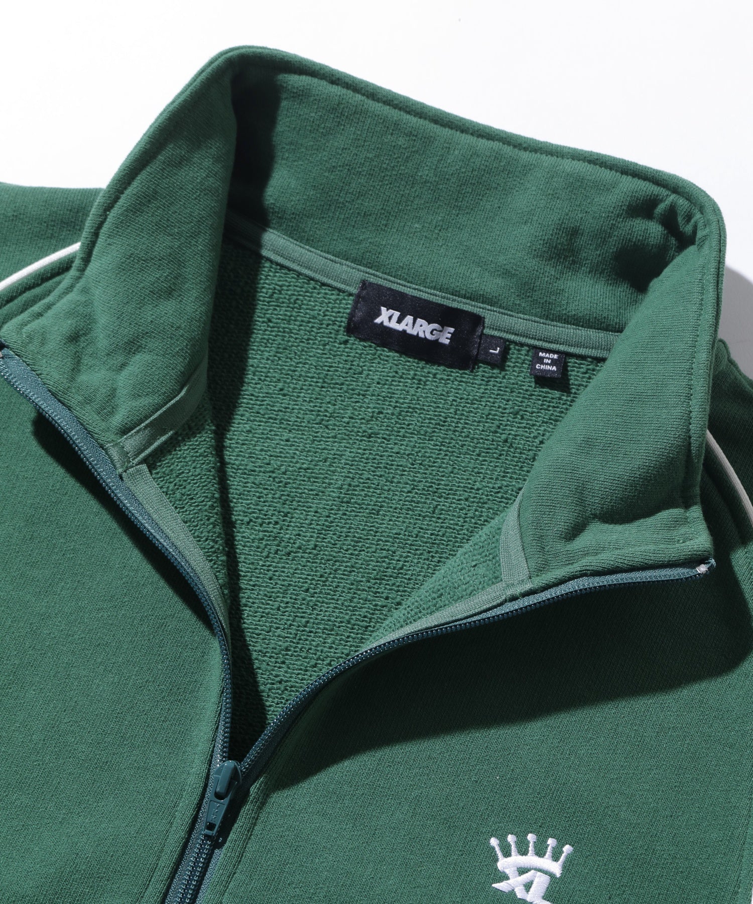 A zip-up sweatshirt featuring a distinctive logo embroidery and piping design on the left chest.