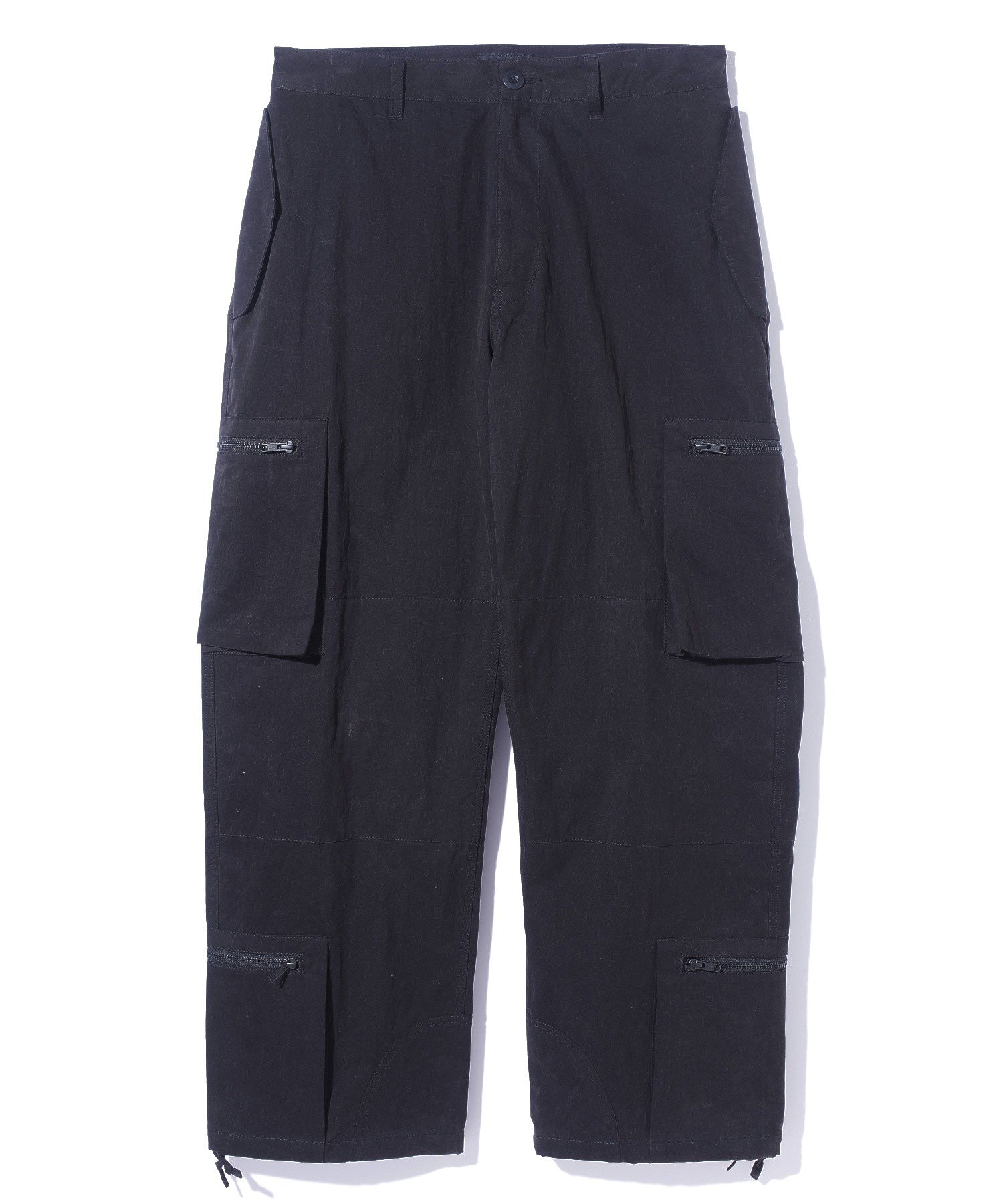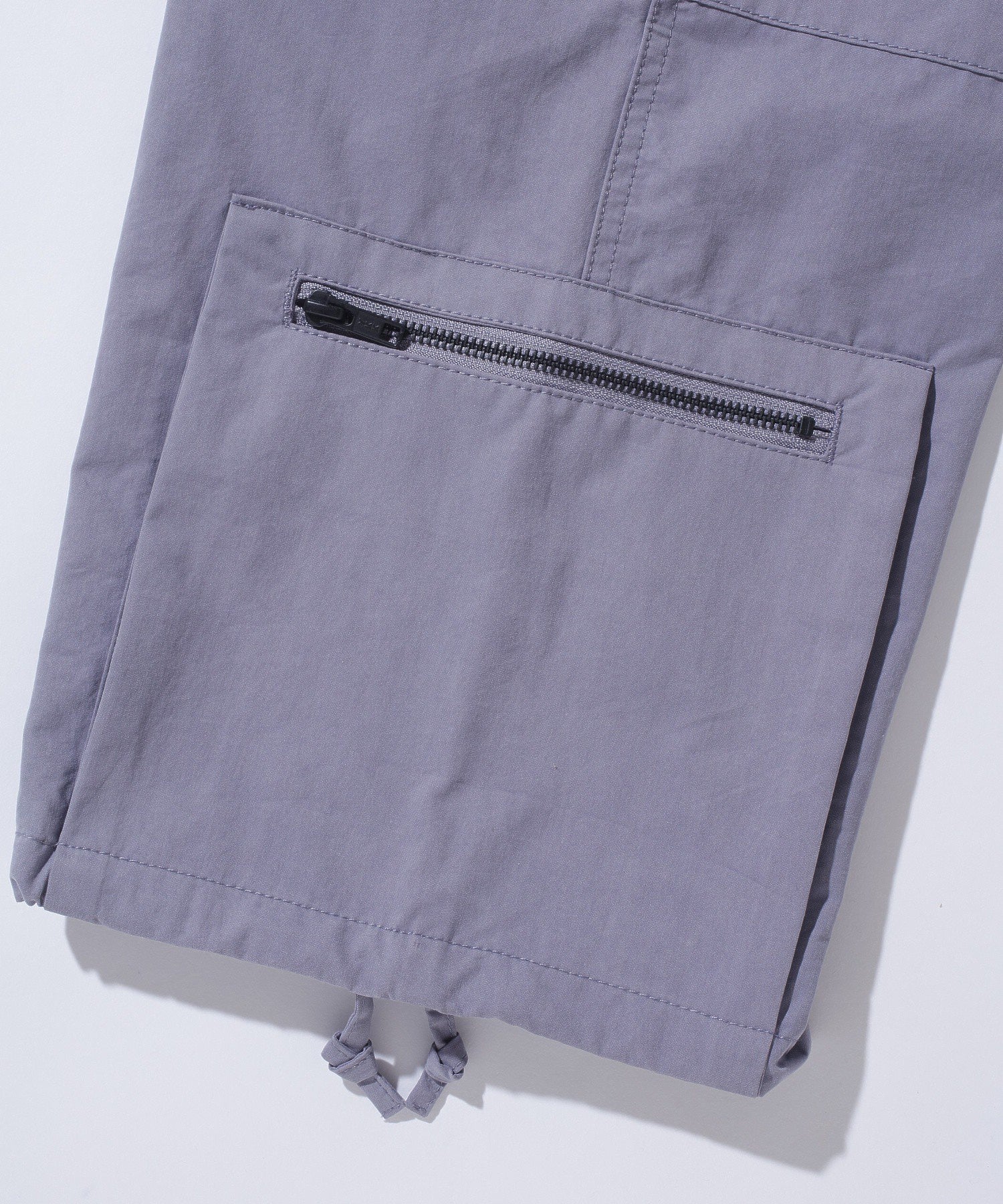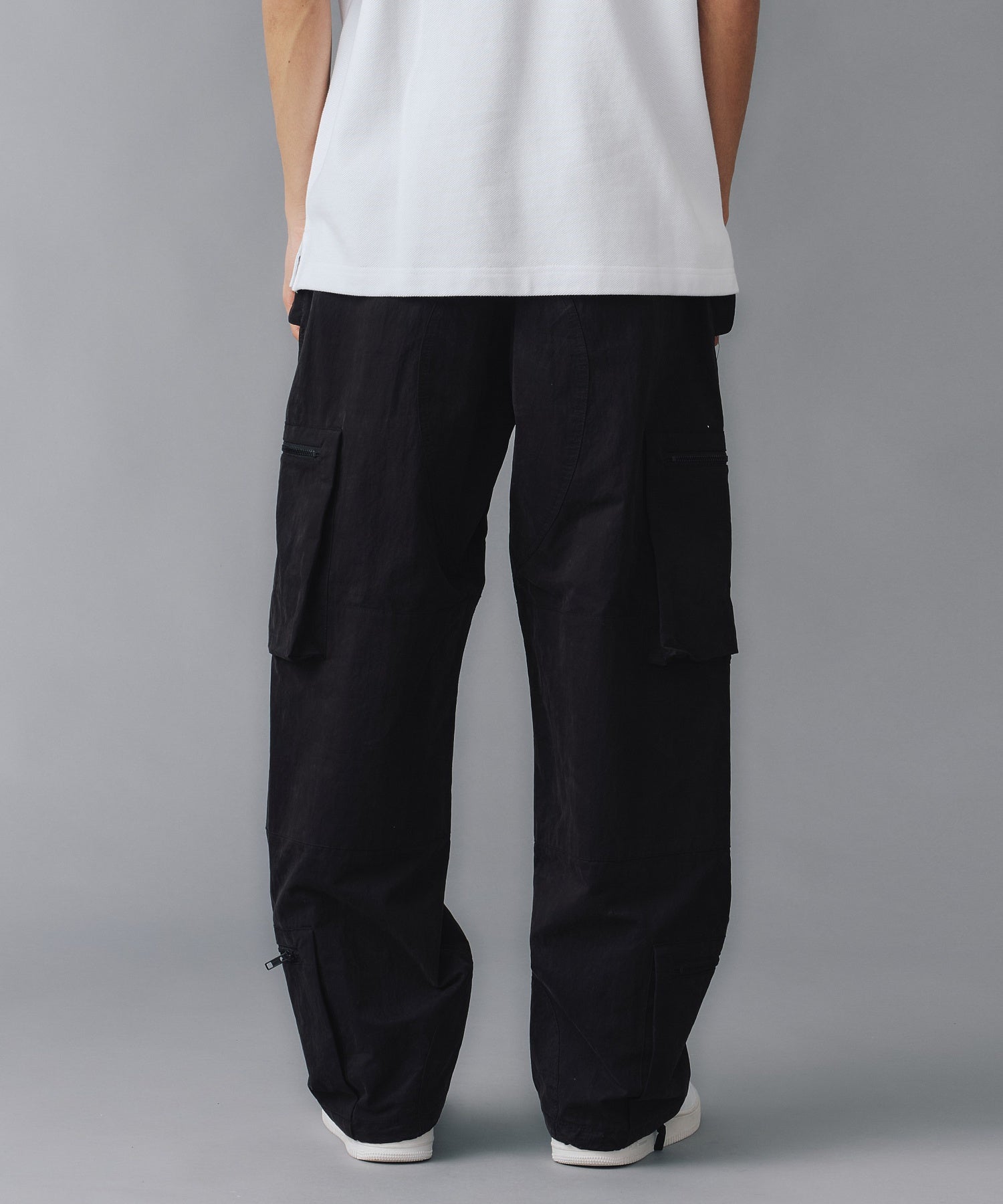 Cargo pants with pocket and panel designs. Equipped with drawstrings at the hem for adjustable styling. Crafted from a blend of cotton and nylon fabric, prioritizing breathability and durability against friction.