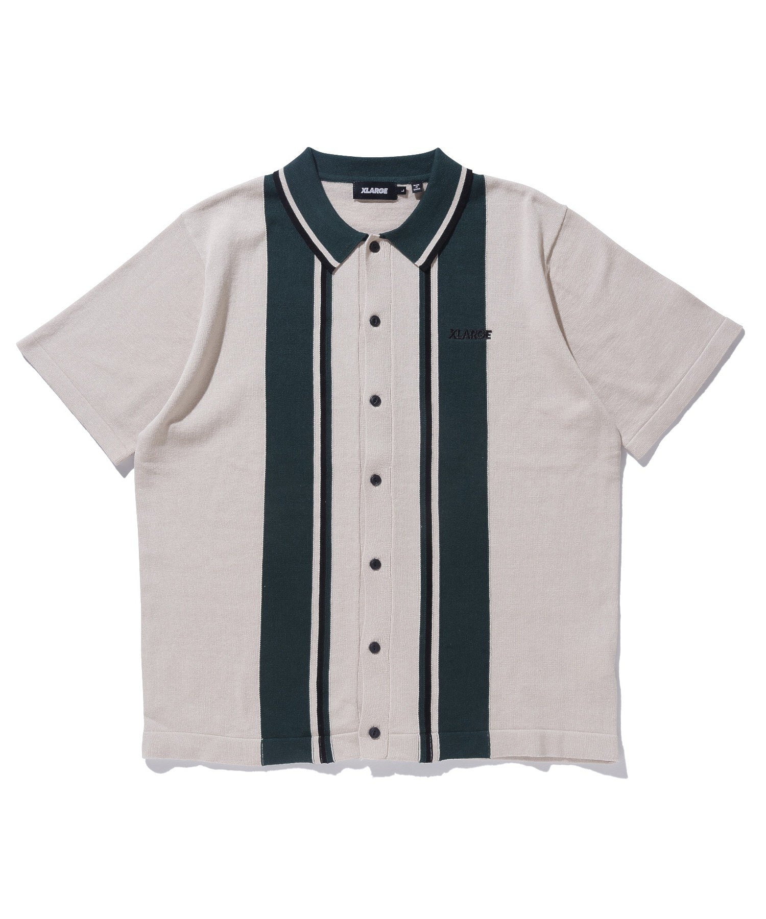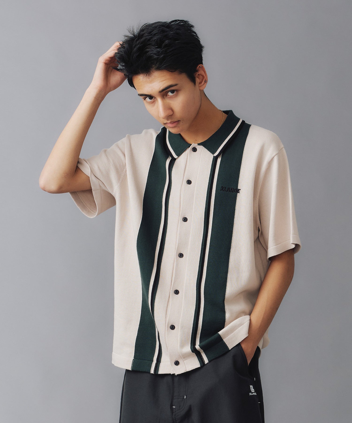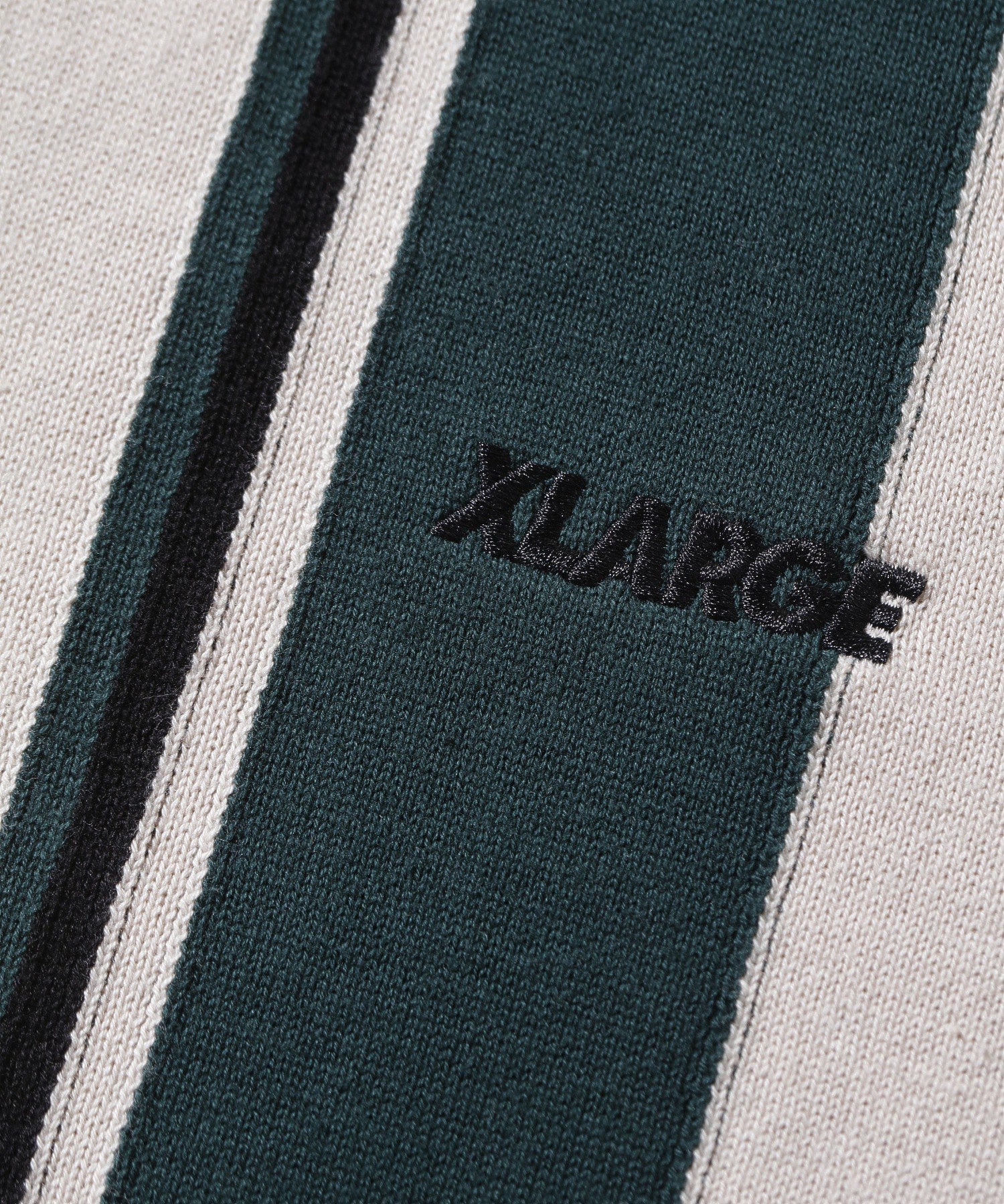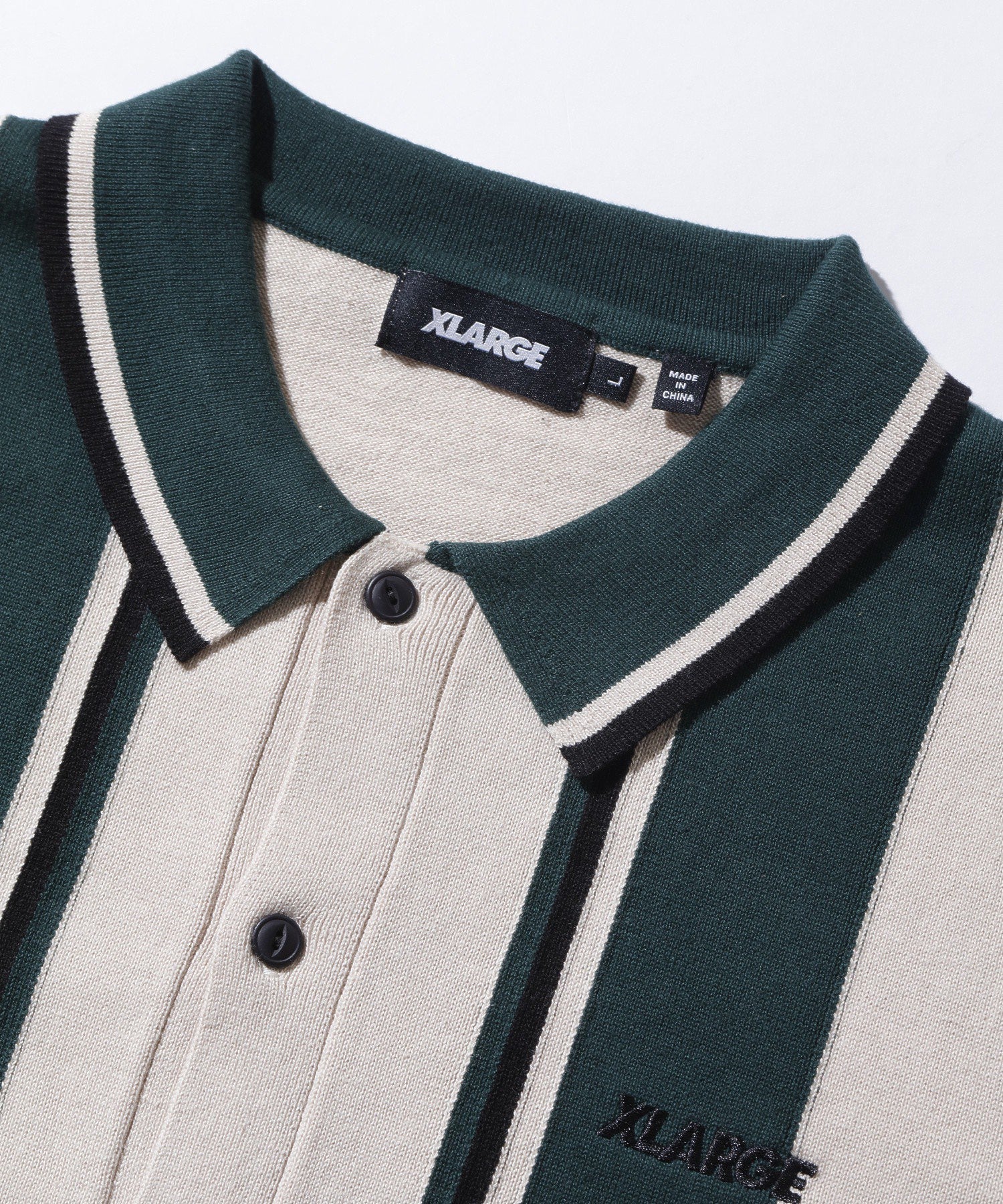 A cotton knit polo shirt highlighted by contrasting color lines and XLARGE logo embroidery positioned on the left chest.