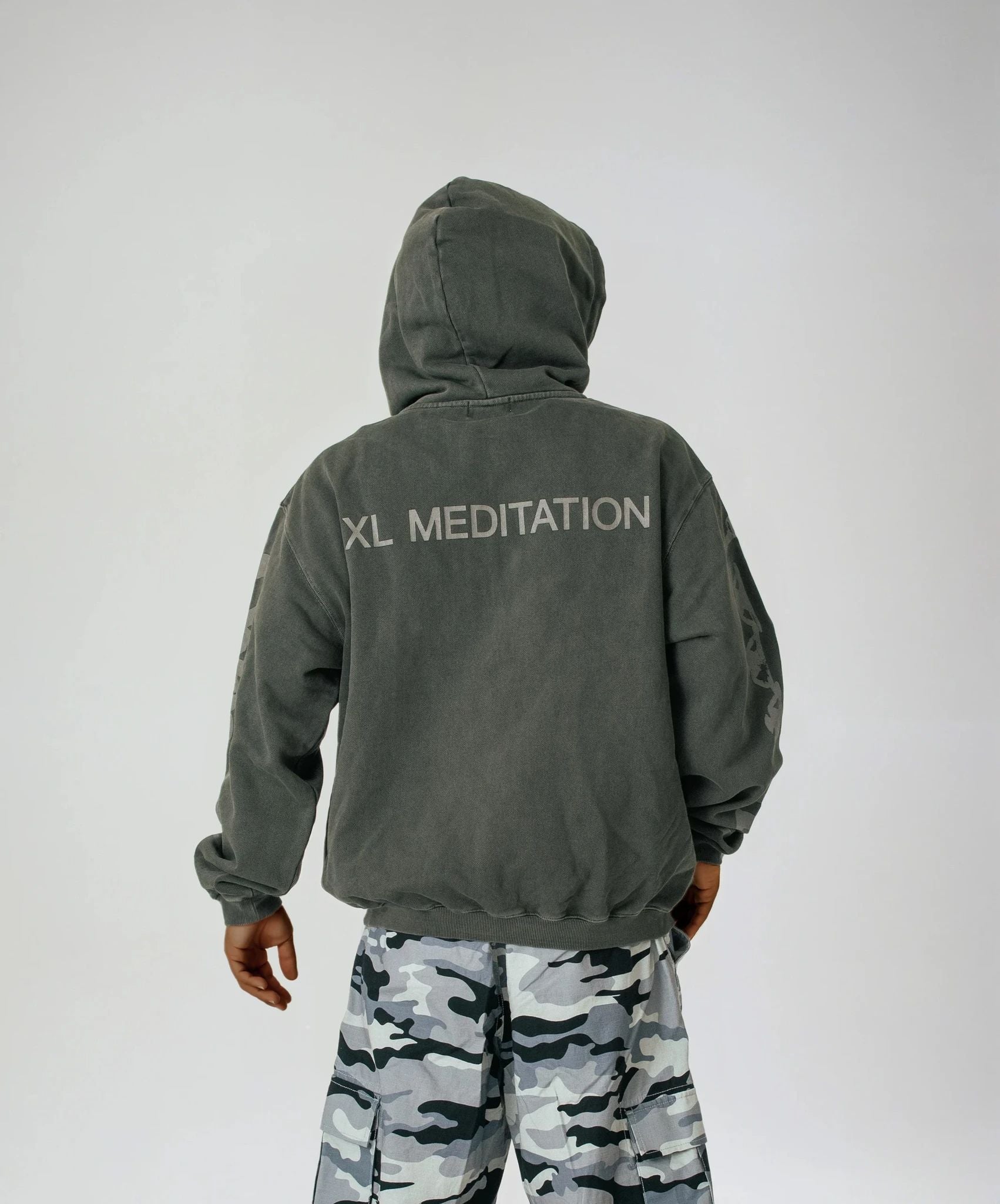 Full zip hoodie with printed graphics on the front, back, and both sleeves, perfect for those who want graphic depth without sacrificing comfort. The visuals suggest focus under pressure - a reminder that clarity can exist even in chaos. The washed tone keeps the piece grounded and easy to style. Shortened cuffs give the sleeves a streamlined, contemporary finish.