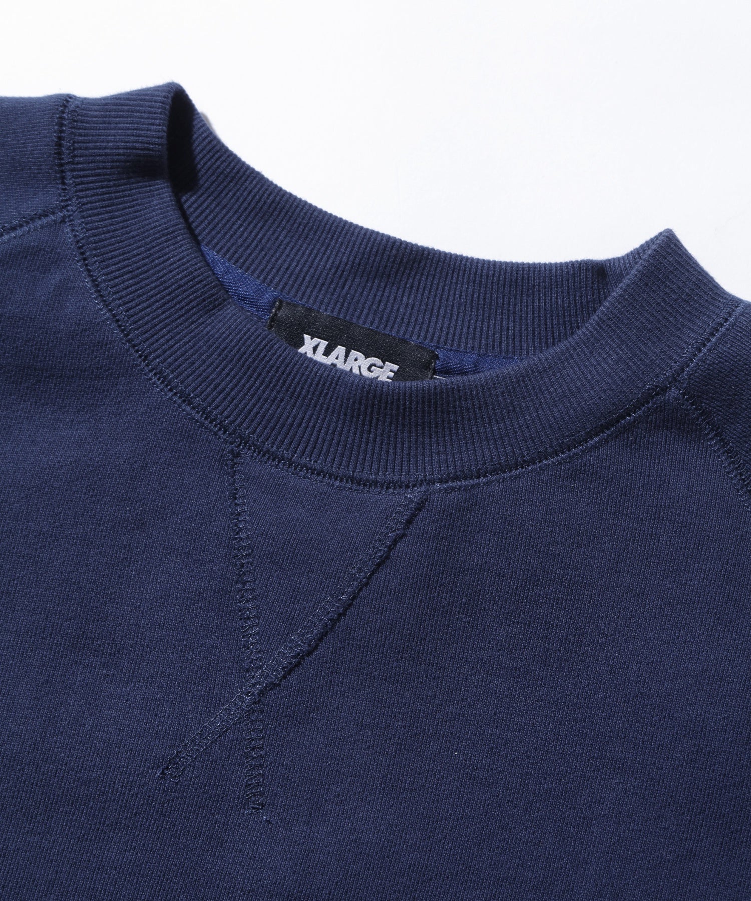 A raglan crew-neck sweatshirt that incorporates military-inspired elements such as patches placed on the right hem and V-shaped embroidery at the neckline.