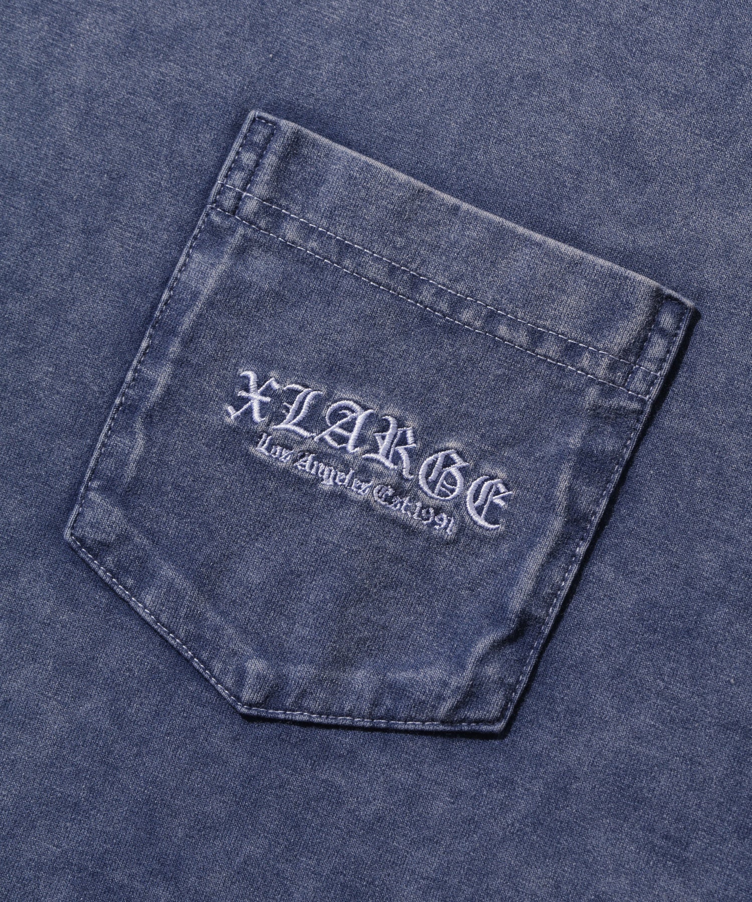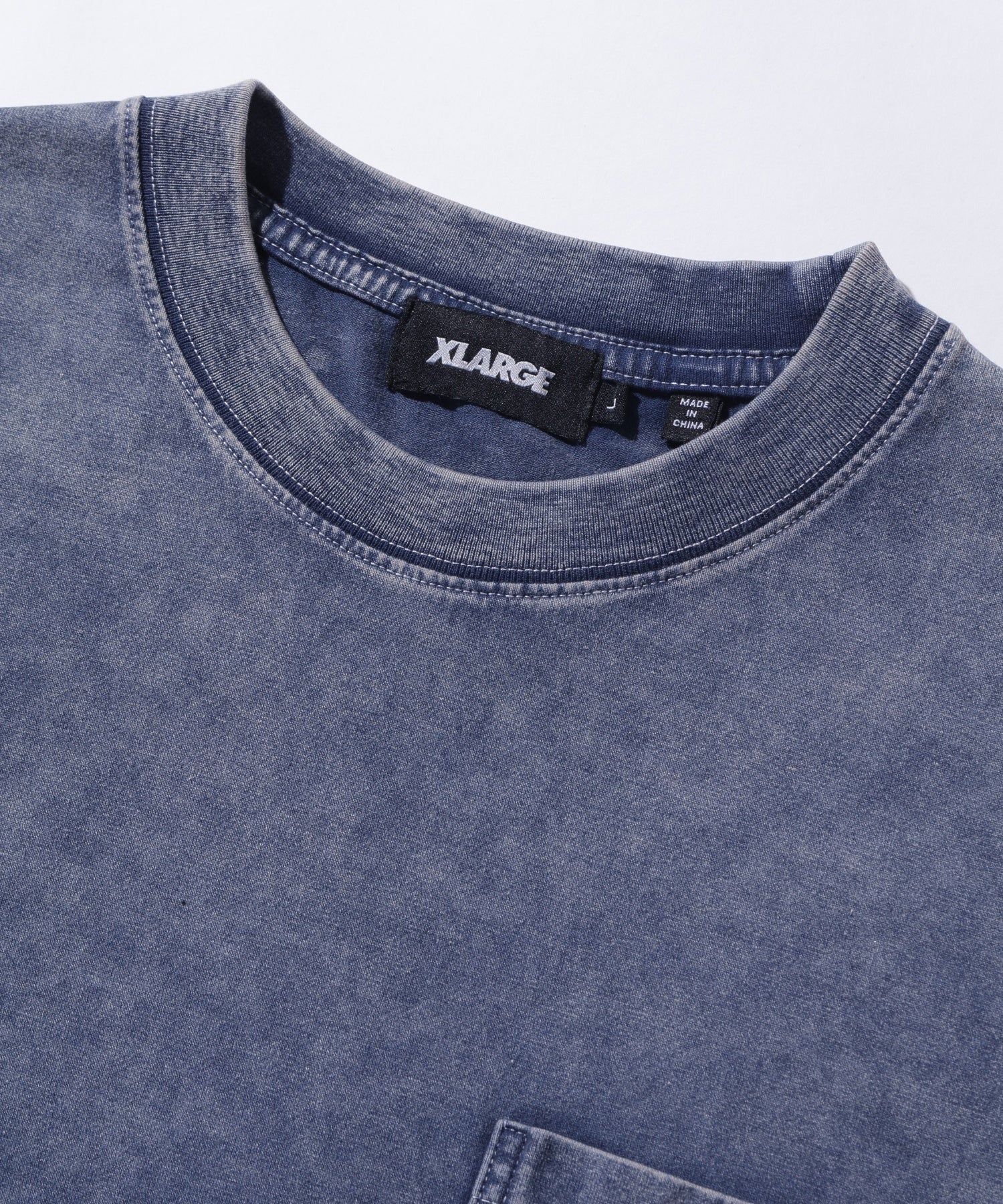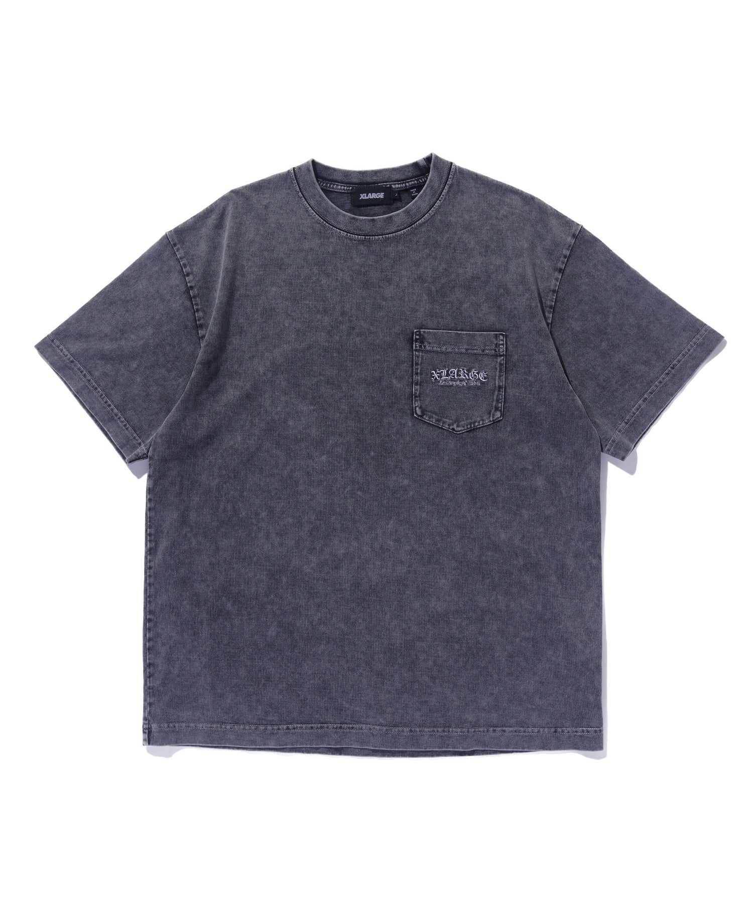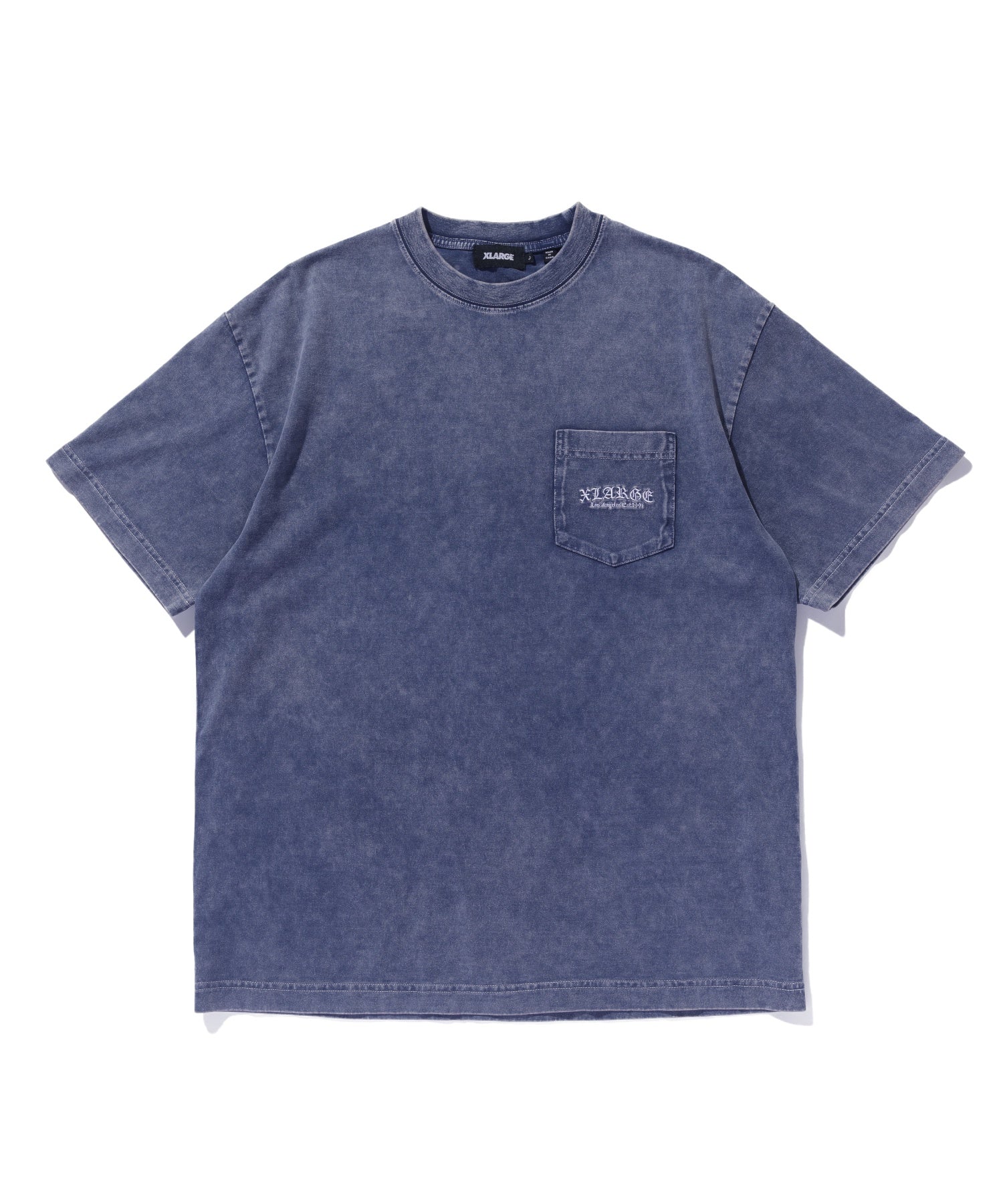 This short-sleeve pocket T-shirt features a standout XLARGE original graphic embroidery placed on the front left chest. It is crafted with an overdyed finish, creating a unique texture with a worn-in look and subtle variations in color.