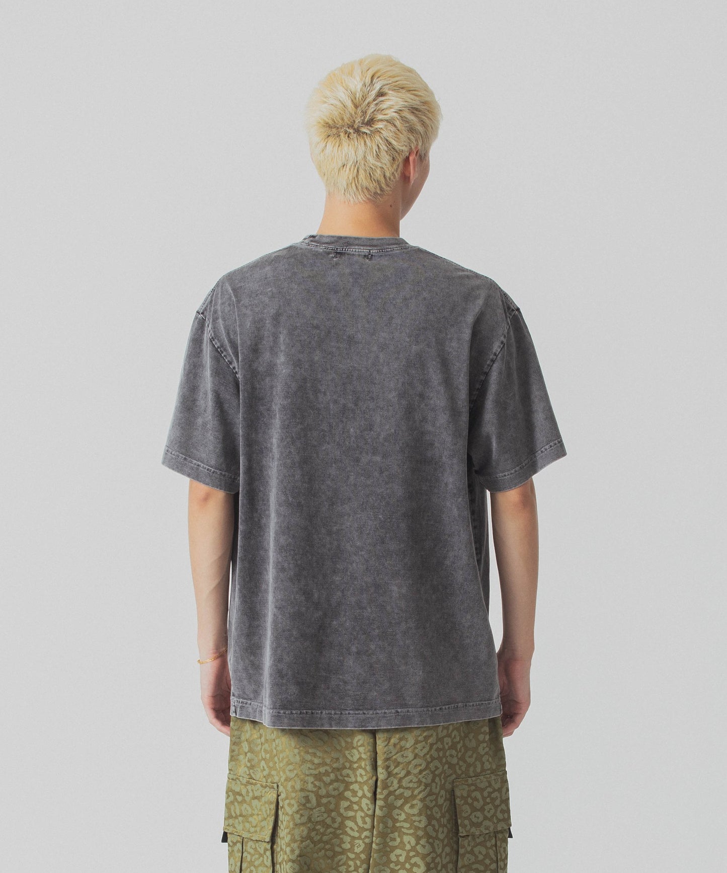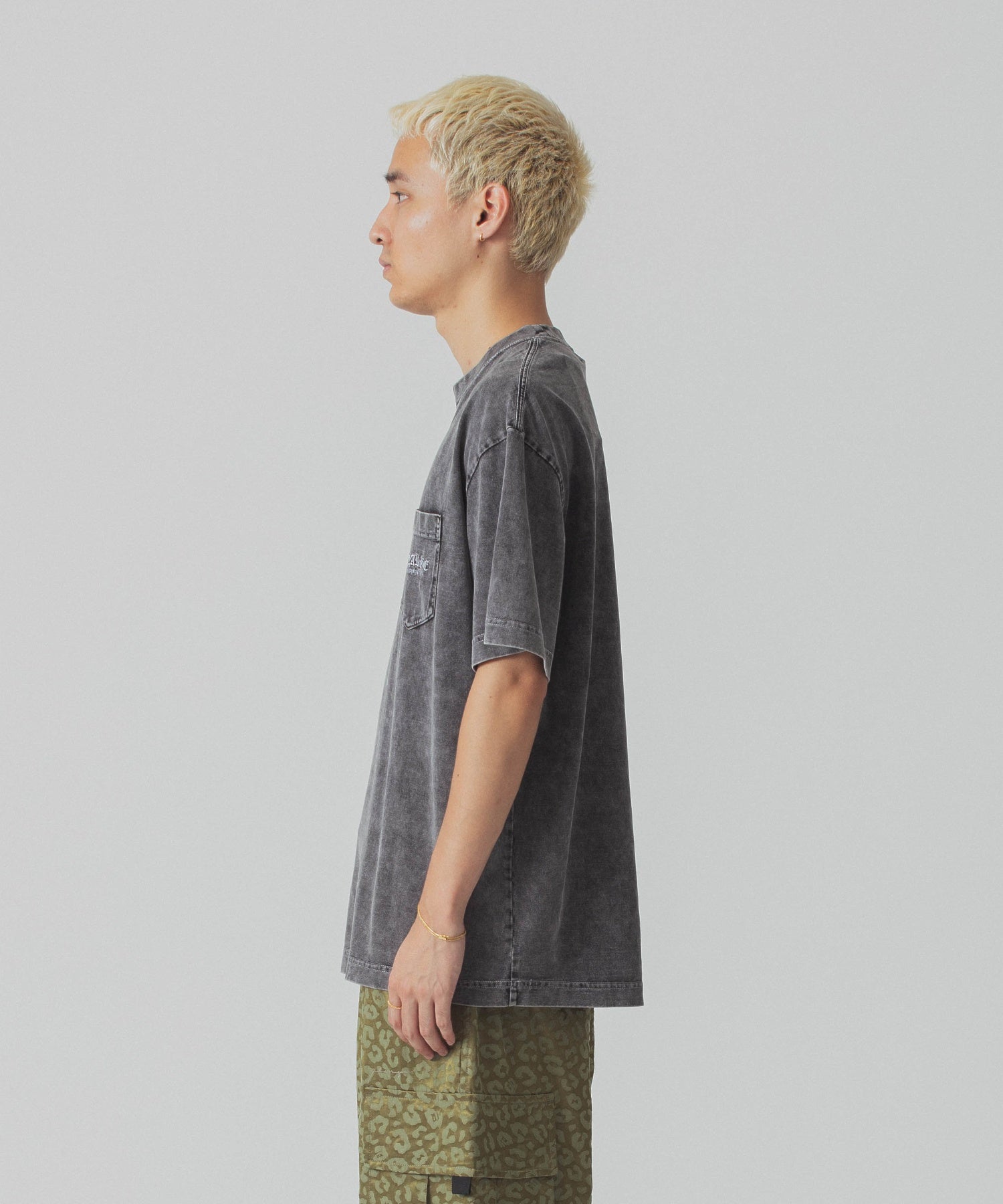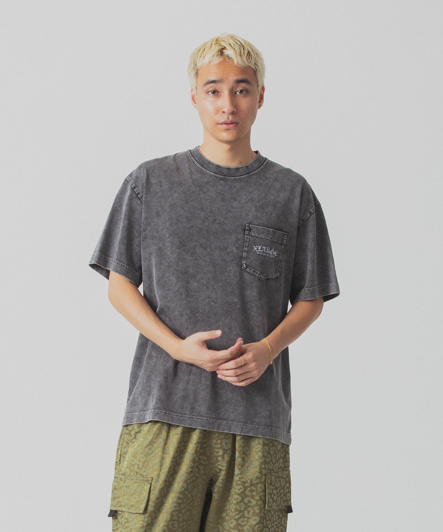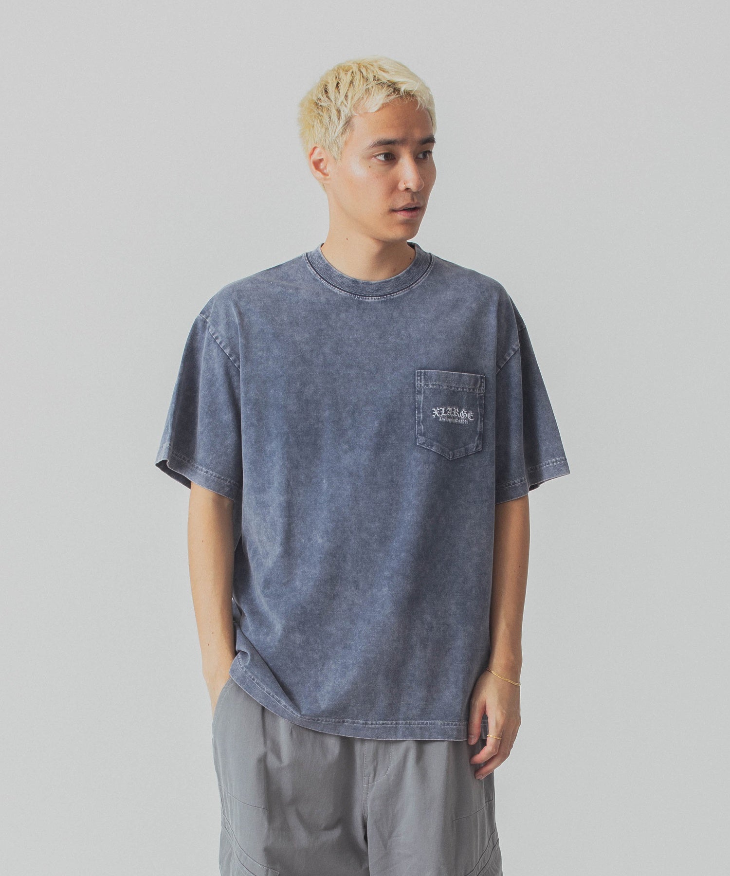 This short-sleeve pocket T-shirt features a standout XLARGE original graphic embroidery placed on the front left chest. It is crafted with an overdyed finish, creating a unique texture with a worn-in look and subtle variations in color.