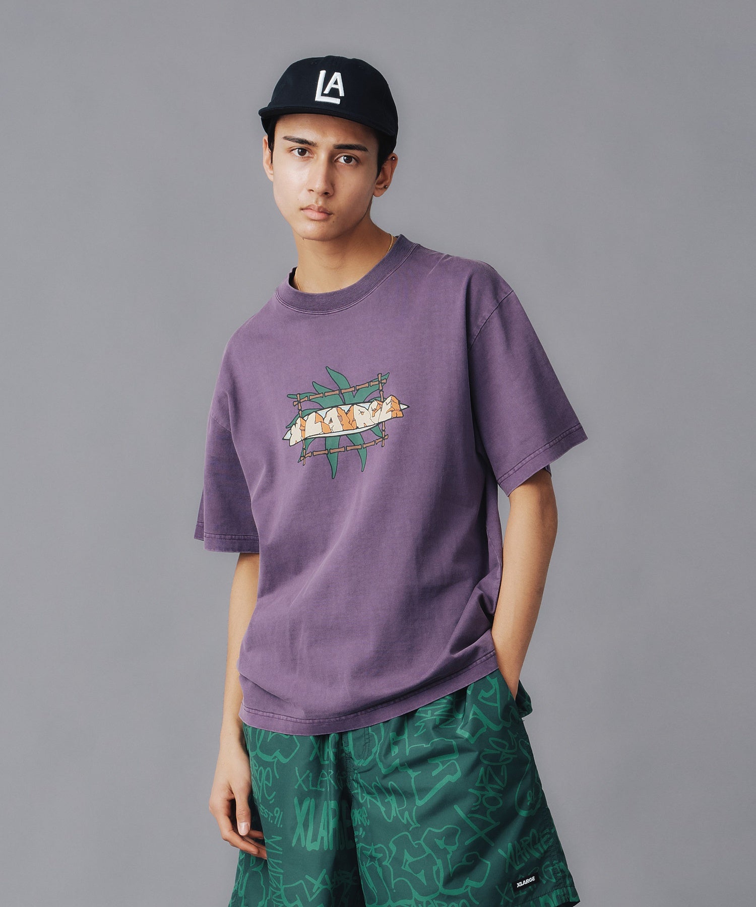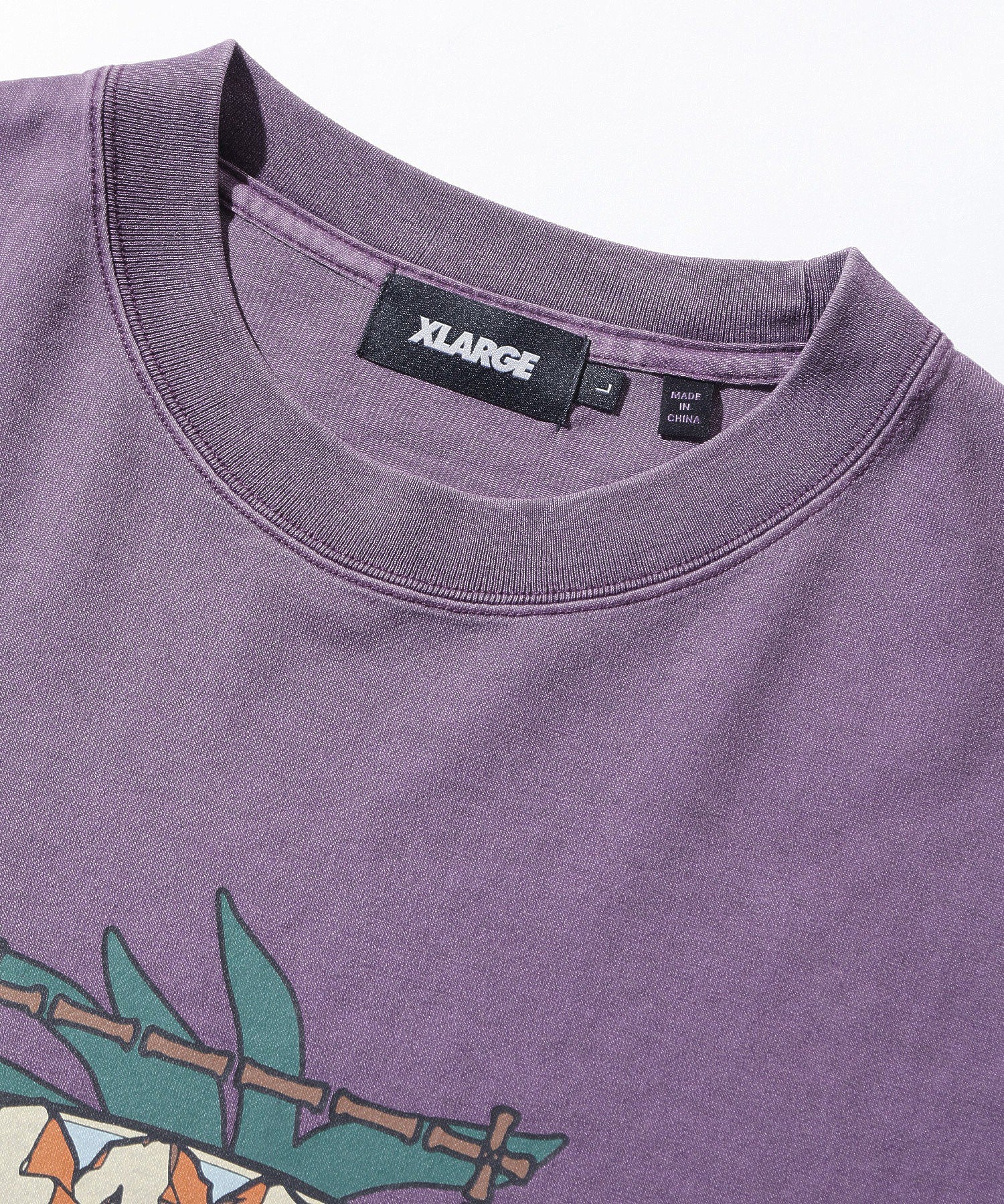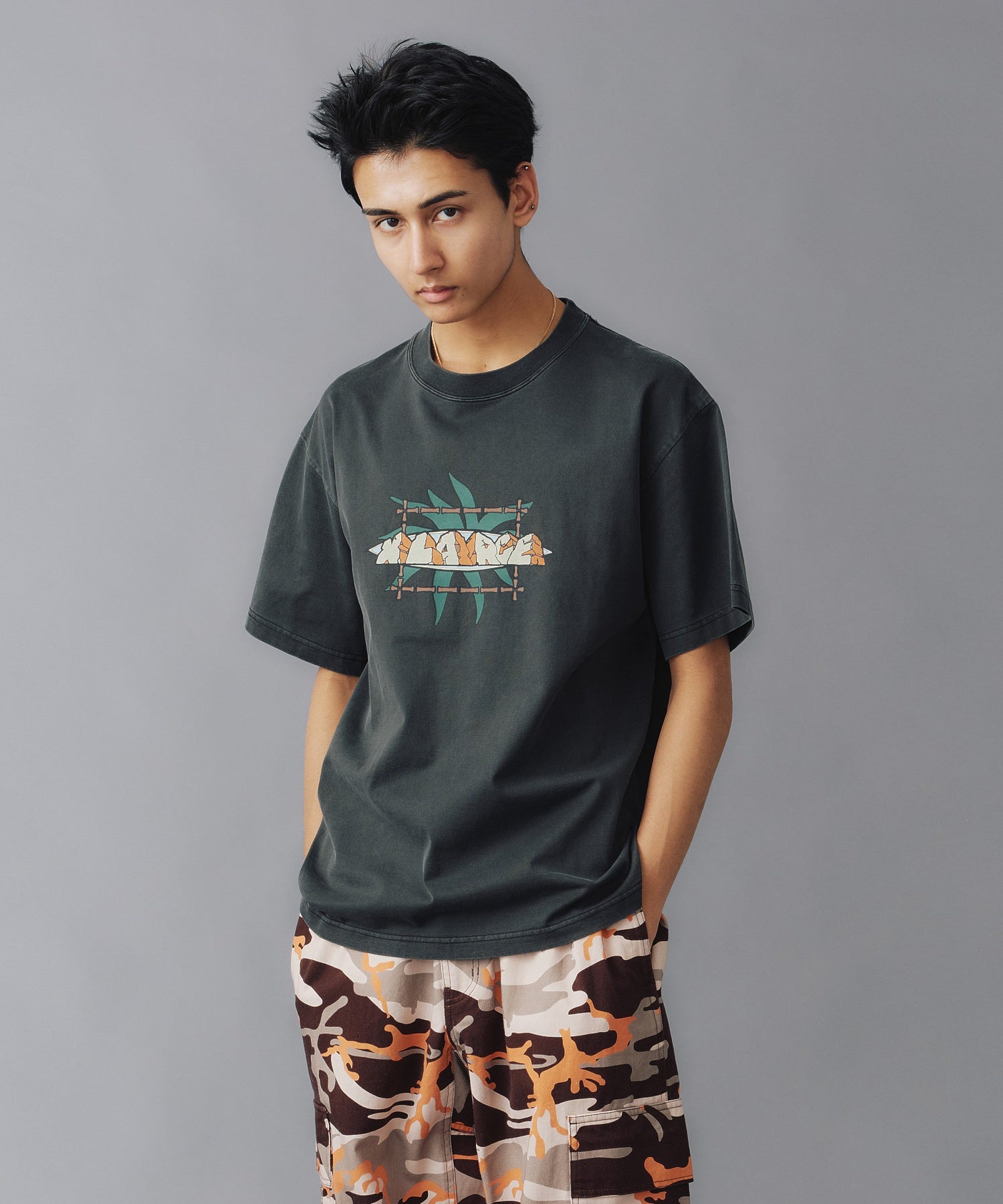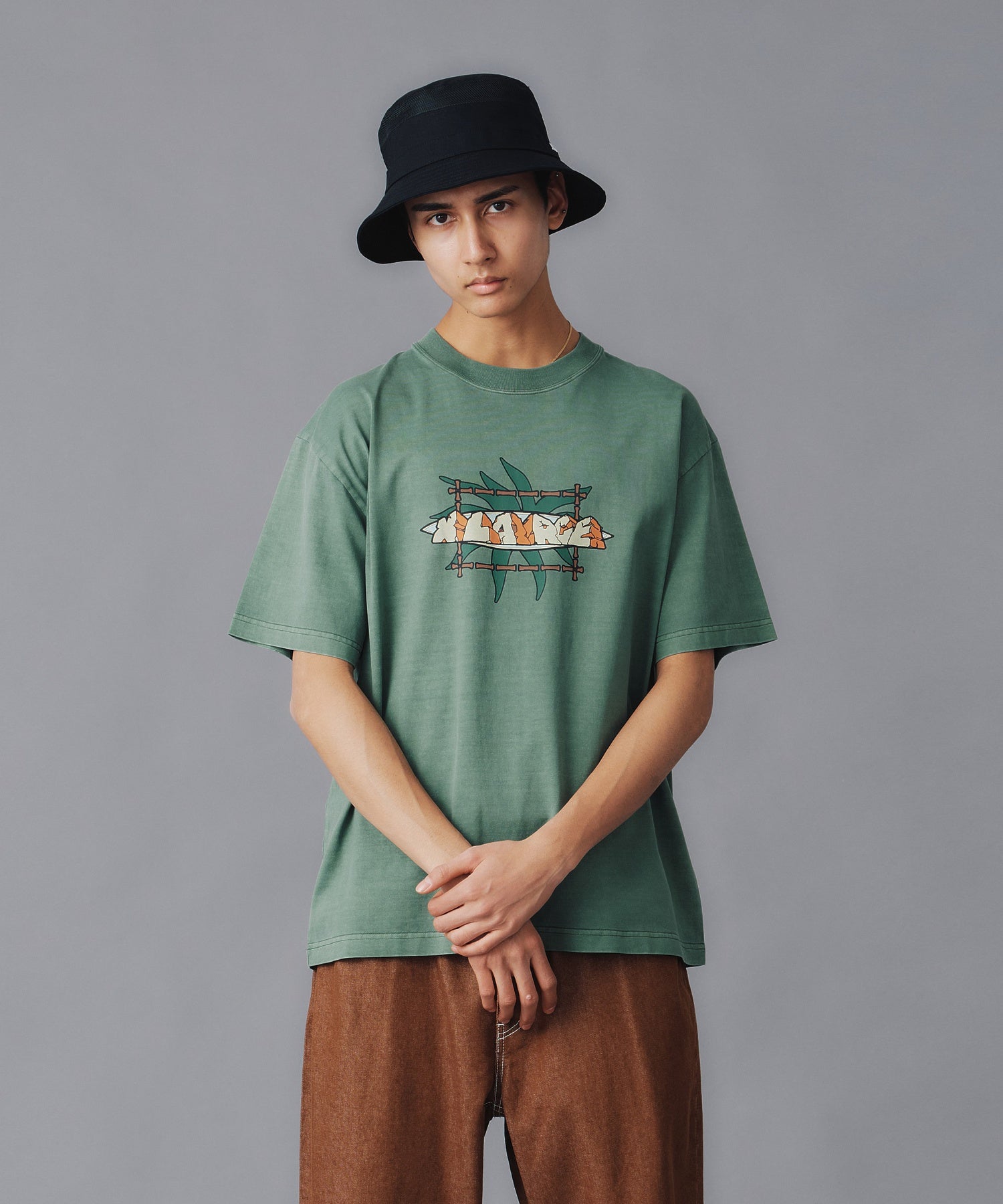 A short-sleeve T-shirt featuring an original graphic print on the front and a jacquard neckline, with pigment processing.