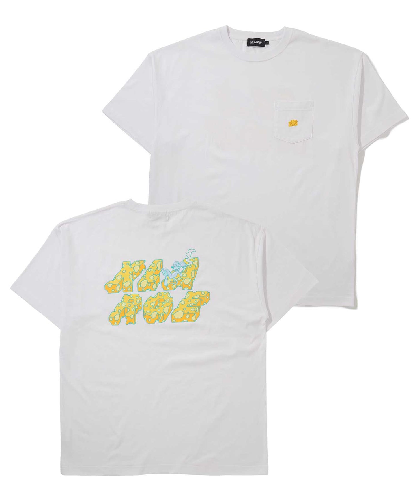Logo print on the back, and a cute cheese embroidery on the front pocket.